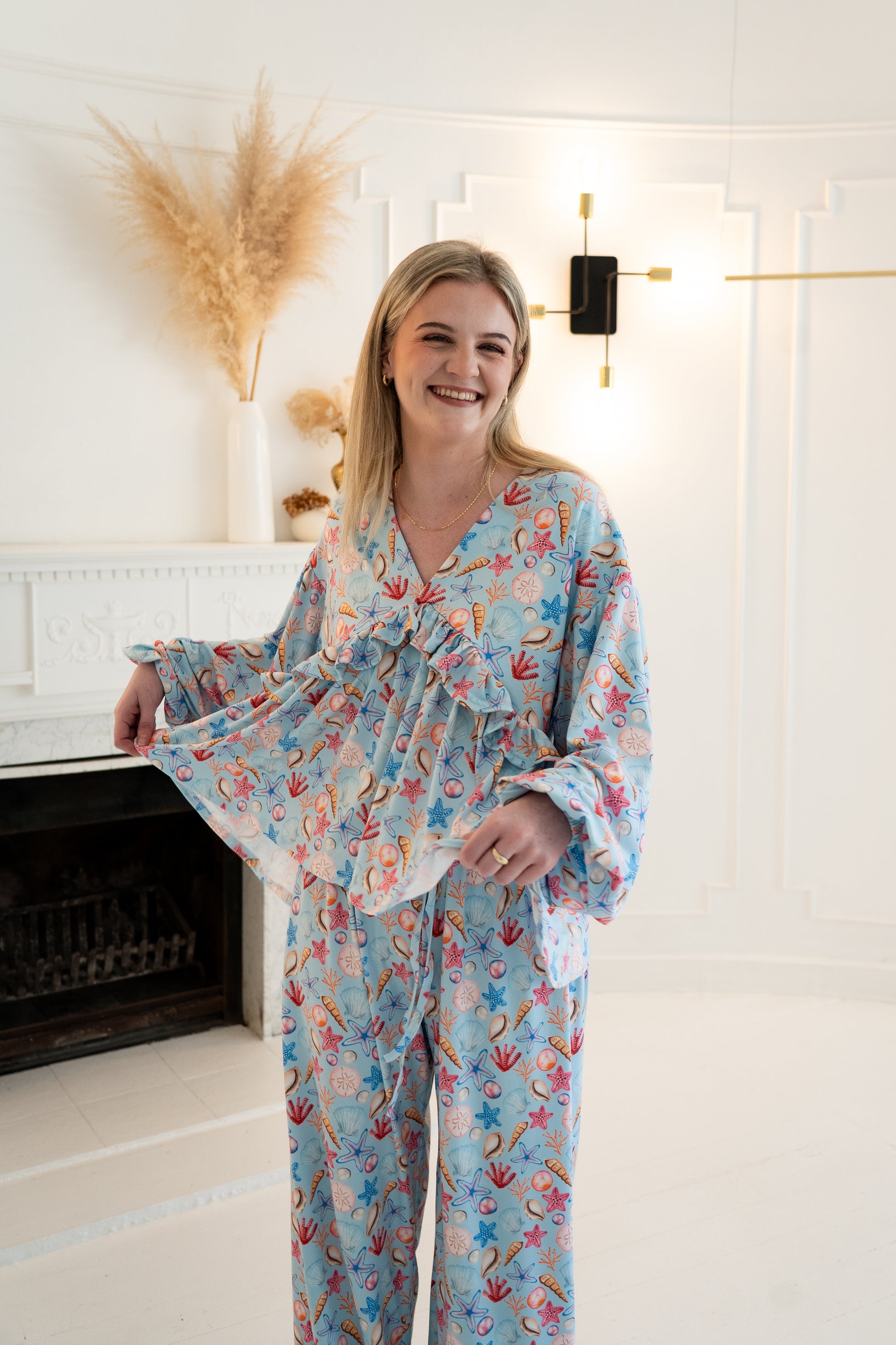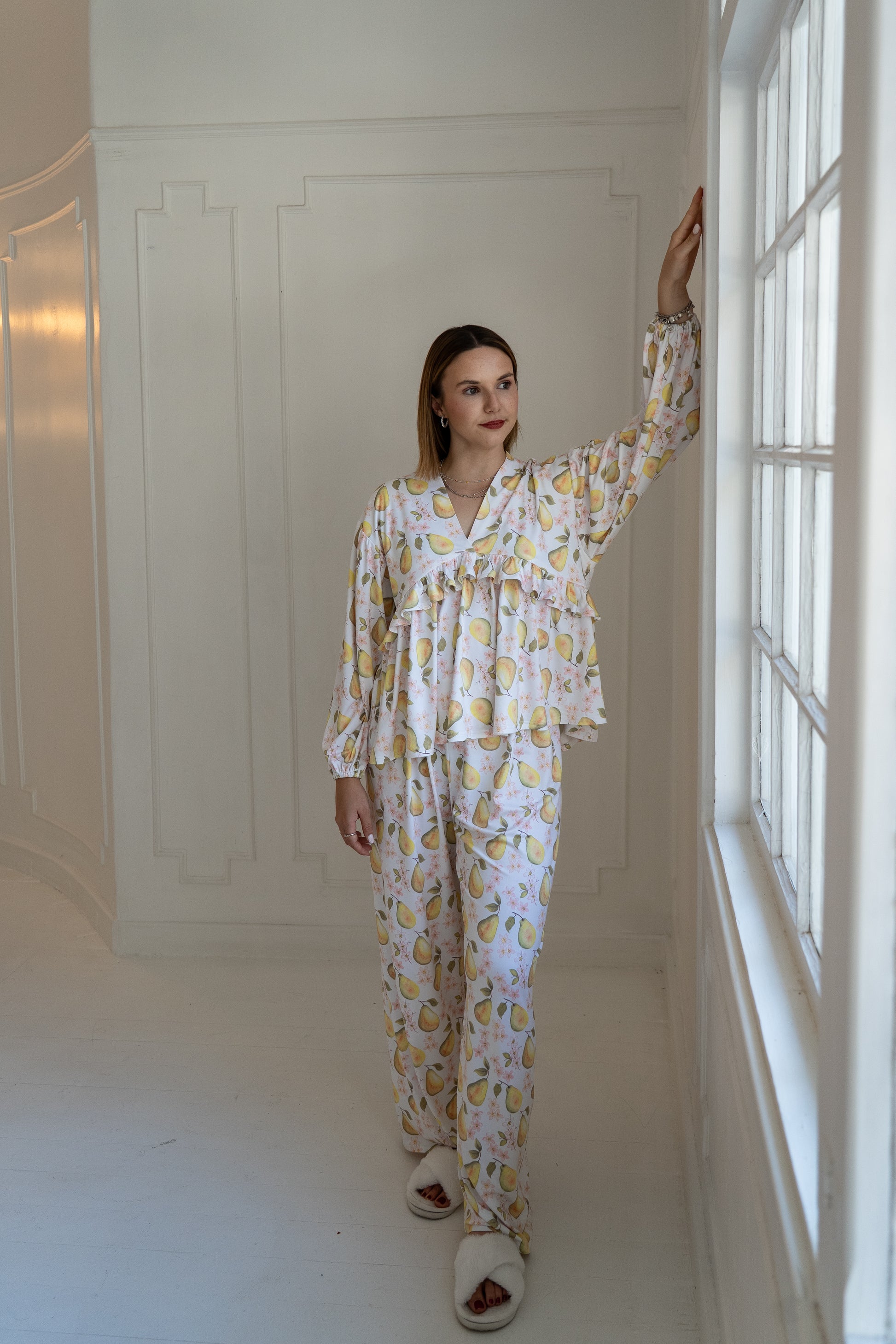 The relaxed fit features a flowy, ruffled top with a flattering V-neckline and full-length sleeves, paired with matching wide-leg pants for all-night (or all-day) comfort. Perfect for slow mornings, cozy evenings, or simply lounging in style.